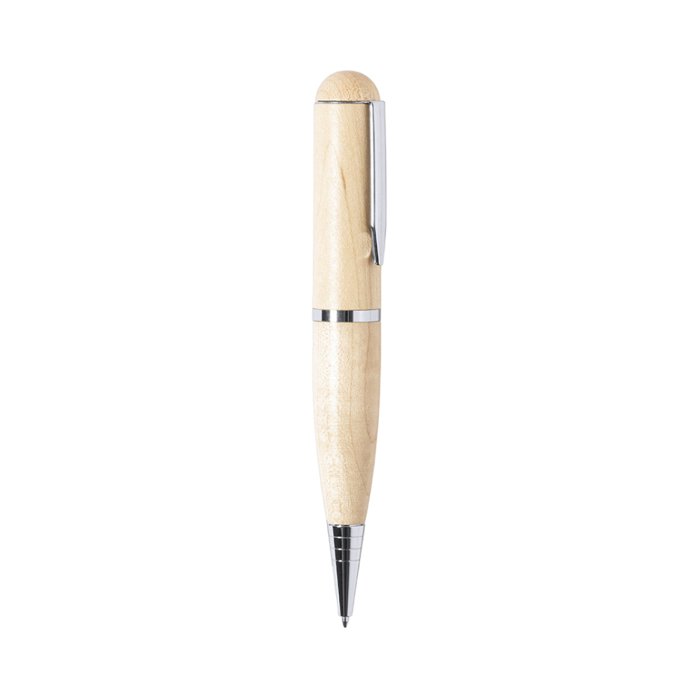 Opte por brindes ecológicos e com menor pegada ambiental. Esta esferográfica de madeira e peças acessórias metálicas tem memória USB, podendo ser personalizada no corpo da caneta e na tampa. Com mecanismo de torção e tinta azul, será um excelente tipo de brinde corporativo ou merchandising promocional para oferta em reuniões, feiras e congressos.