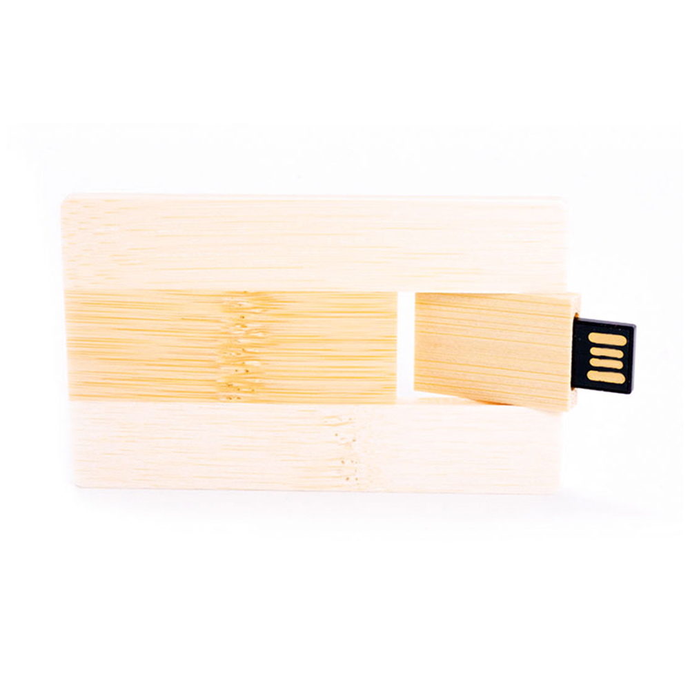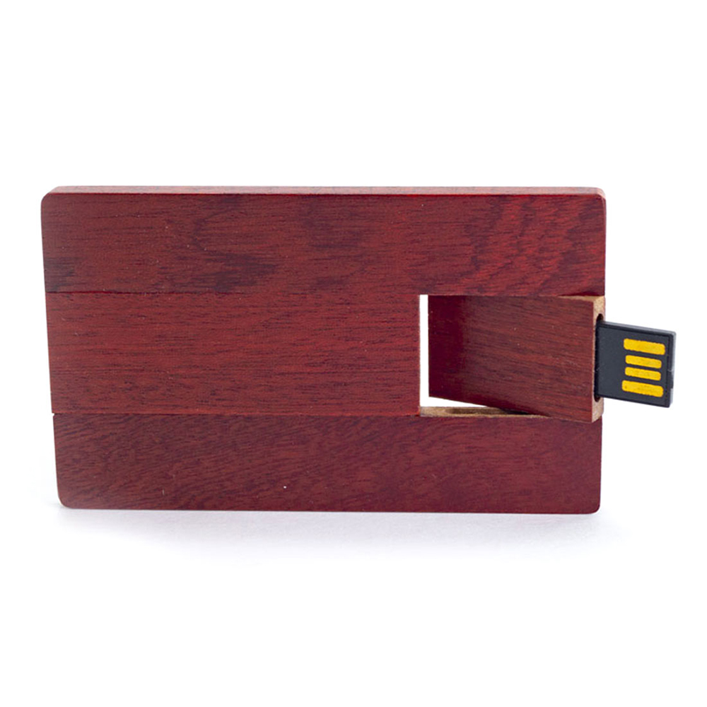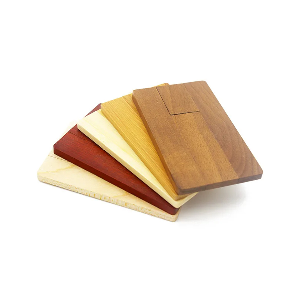 Pen USB de madeira em formato de cartão de crédito. Disponível em 2.0 e 3.0.