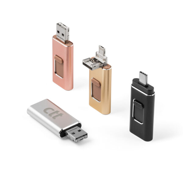 Aqui encontra memórias USB diferentes. Para além do uso e do propósito de uma pen drive – um brinde tecnológico promocional com capacidade de promover a sua marca ou empresa e possibilidade de armazenamento de dados – estas pens podem ser também porta-chaves, fita lanyard para o pescoço, abre-garrafas, pulseiras ou dispositivos com várias conectividades (USB + Tipo-C + Micro USB + Lightning).