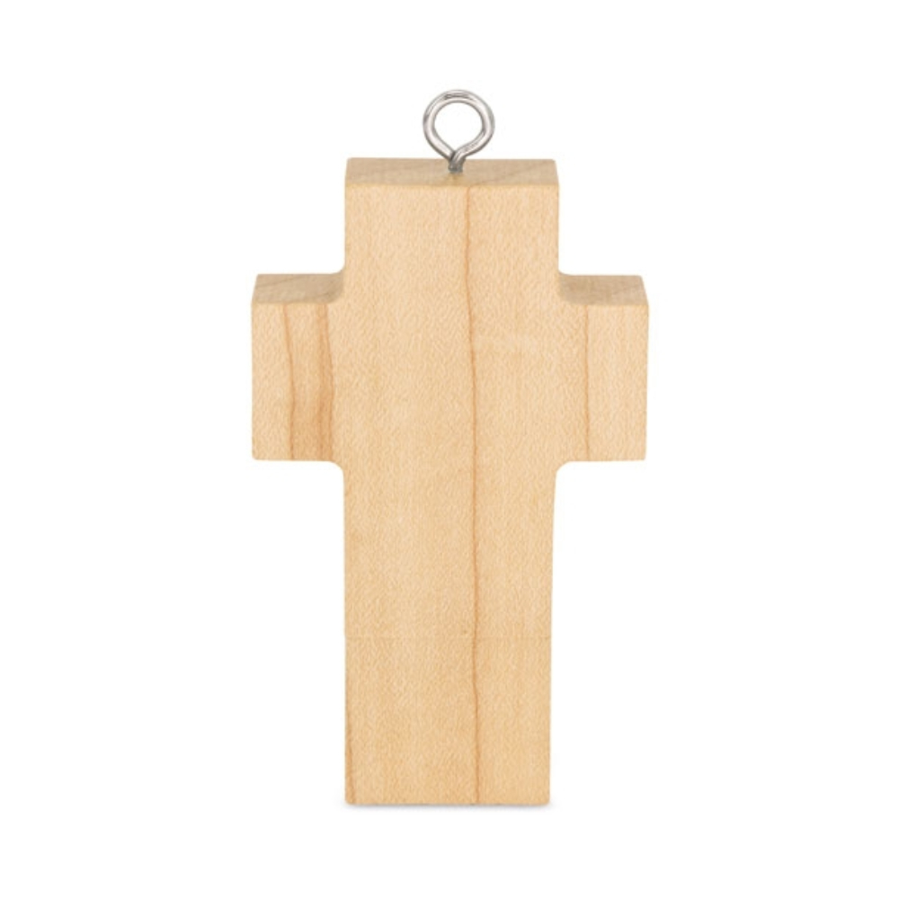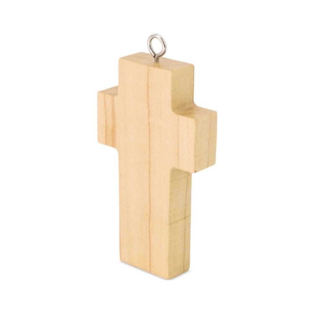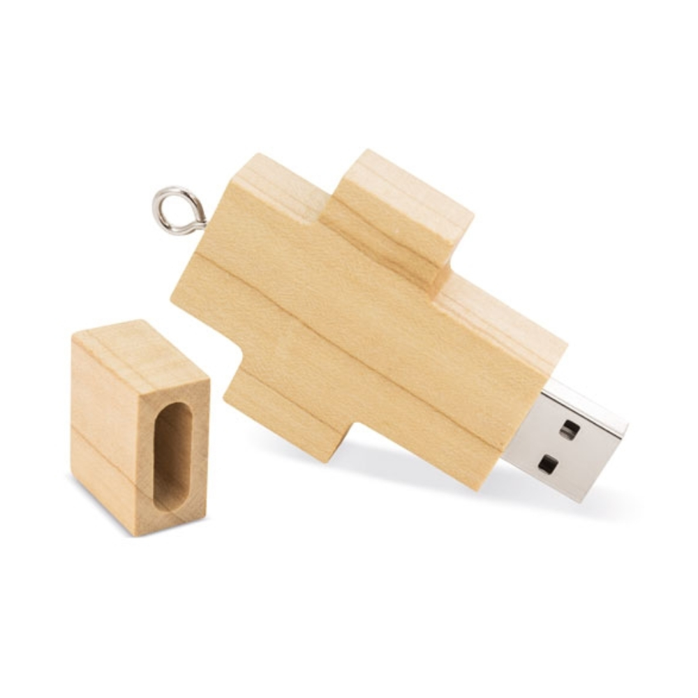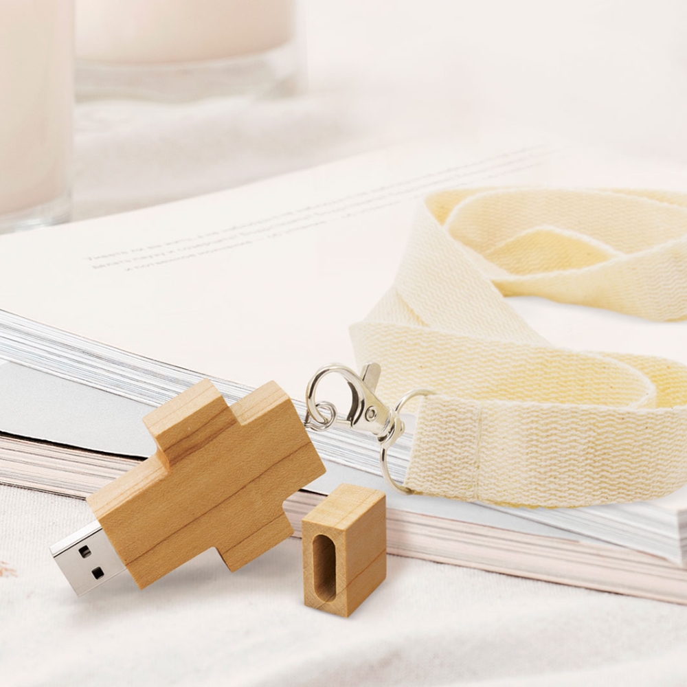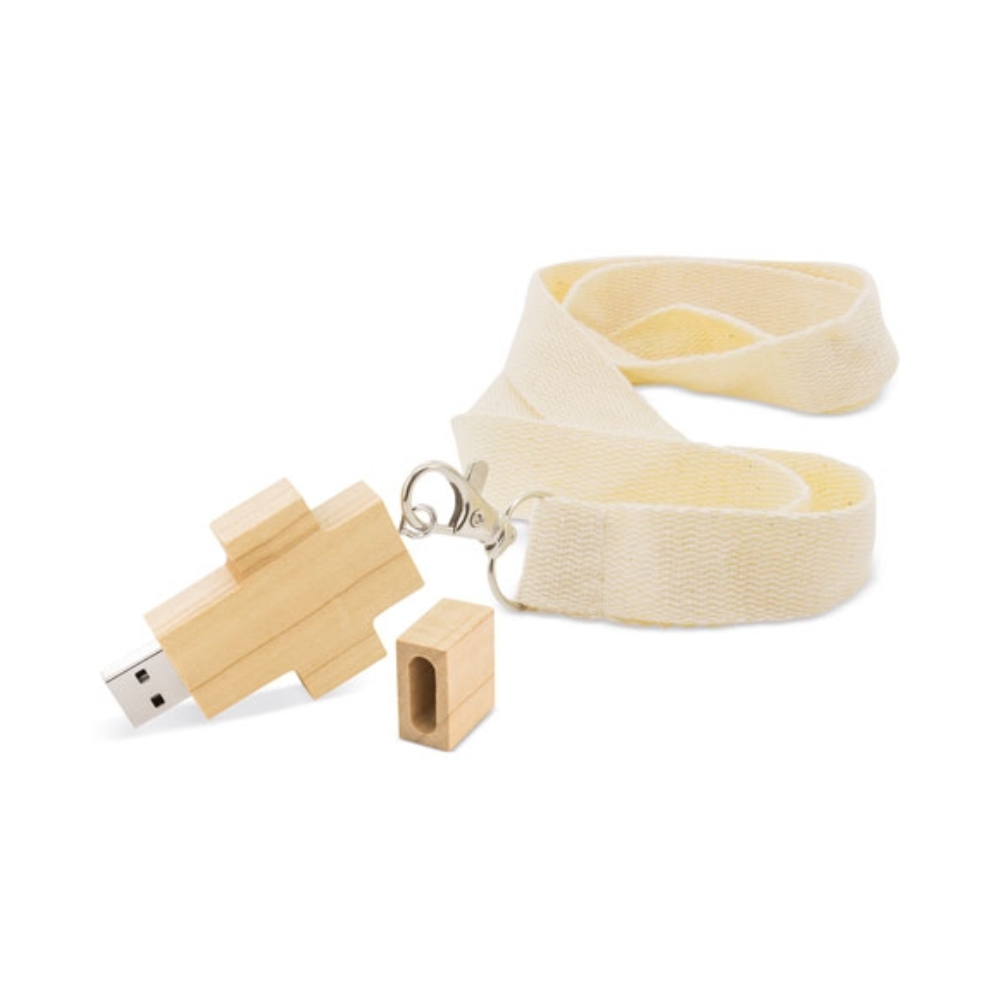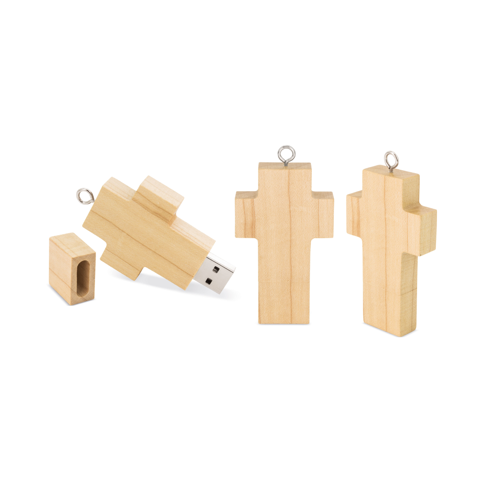 Pen USB em formato de cruz com interface 2.0 ou 3.0. Capacidades de 2GB a 256GB, combinando simbolismo e funcionalidade.