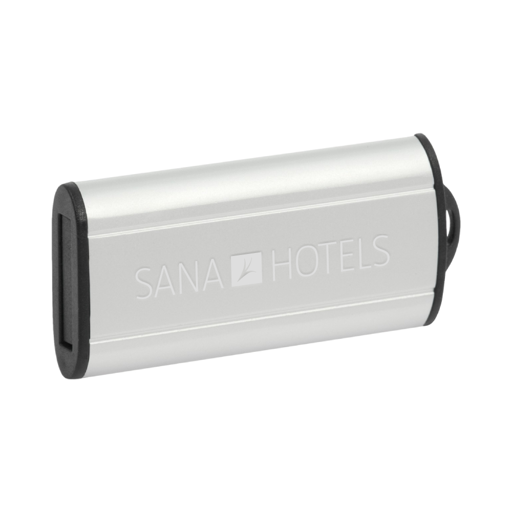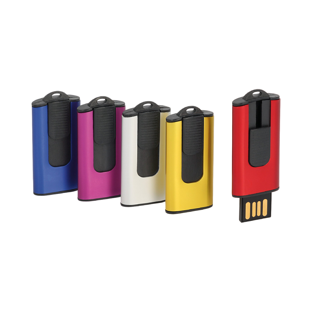 Memória USB em metal com sistema deslizante.