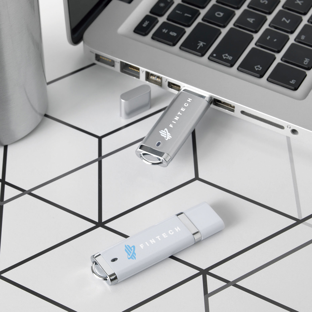 Pen drive em plástico com extremidades em prata metalizadas, oferece um aspeto mais empresarial e clássico para atender às suas necessidades de armazenamento digital.