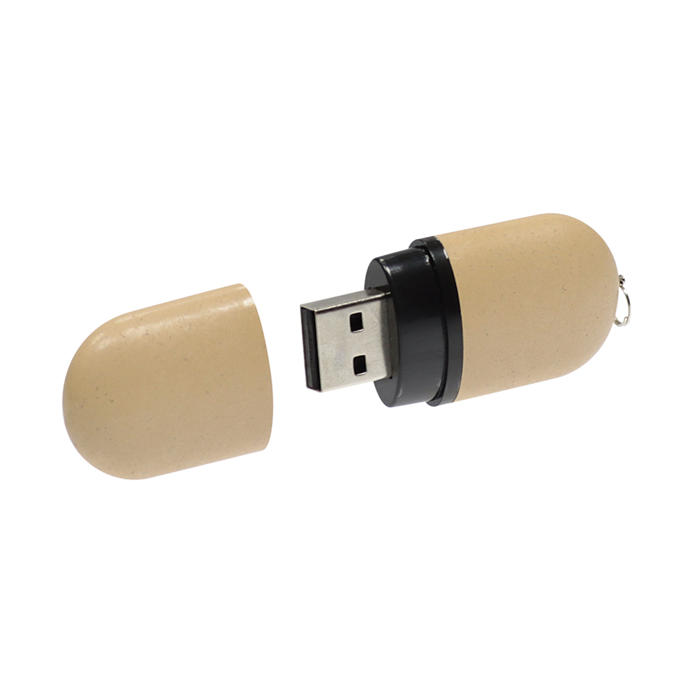 Pen USB de formato oval fabricada em palha de trigo e plástico, 60% e 40% respetivamente. Ofereça brindes personalizados mais sustentáveis.