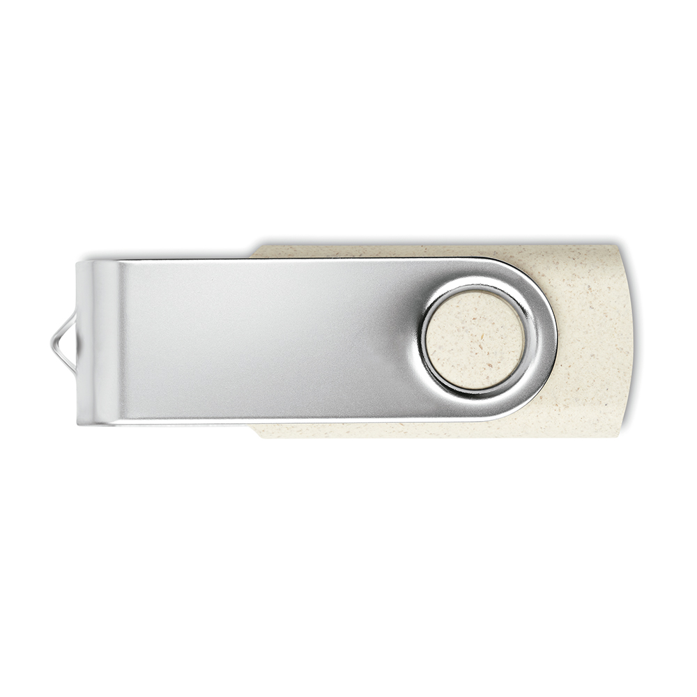 Pen drive USB sustentável com clip giratório, produzida em palha de trigo.